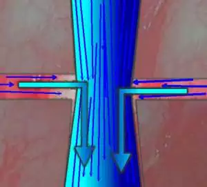 Eine Strömung, die durch eine Verjüngung oder Engstelle vorbeigeführt wird, muss an dieser Engstelle ihre Strömungsgeschwindigkeit erhöhen. Es entsteht ein Sog durch die Teilchen, die schon an der Engstelle vorbei sind. Dieser Sog entsteht auch beim ordinären „Nase Putzen“ und entfaltet seine Wirkung derart an den Nasennebenhöhlengängen, dass Schleim aus den Nasennebenhöhlen gezogen wird. Da Wasser nicht so flexibel wie Luft ist, ist dieser Sog bei einer Nasenspülung noch stärker! Aber wenn die Nase komplett zugeschwollen ist, kann zum einen kein Sog entstehen und zum anderen kann ein Sog an verschlossenen Nasennebenhöhlengängen nicht seine Wirkung entfalten. Um also den entlastenden Sog zu erzeugen, muss die Schleimhaut vorher abschwellen, entweder mit Nasentropfen, Buteyko Atmung, Nasenspülung mit sehr hoher Salzkonzentration.
